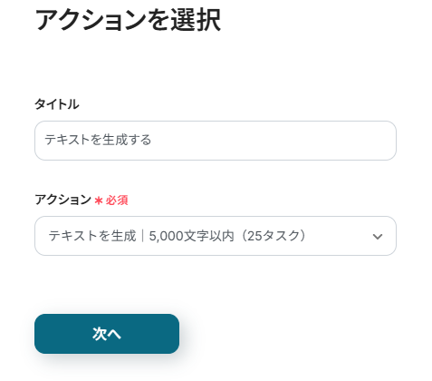 2.想定される文字数に応じてアクションを設定し、「次へ」をクリックします。