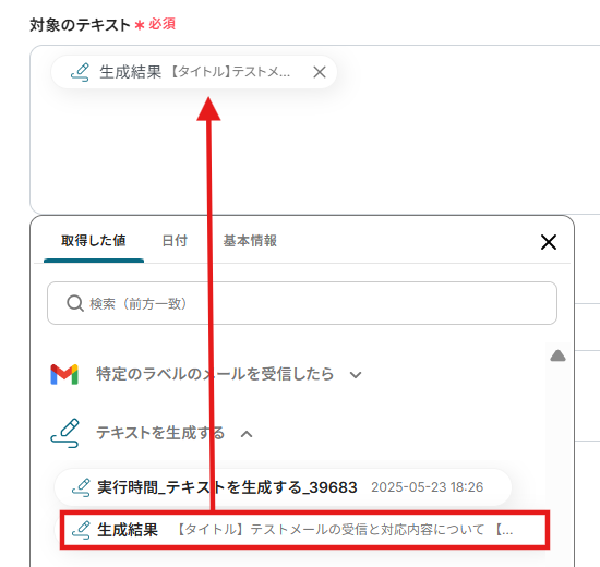3.次に「対象のテキスト」を設定します。 テキストを生成した本文から取得するため、アウトプットから「生成結果」を選択してください。