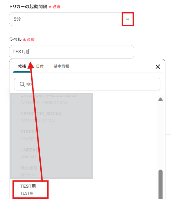 4.用途に合わせて任意の「ラベル」を候補から選択します。 (ここで指定したラベルに一致したメールに絞り込みます。)