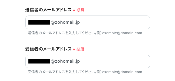 4.「送信者のメールアドレス」と「受信者のメールアドレス」に、それぞれ任意のメールアドレスを設定しましょう。(用途に合わせて、CCやBCCも設定してください。)
