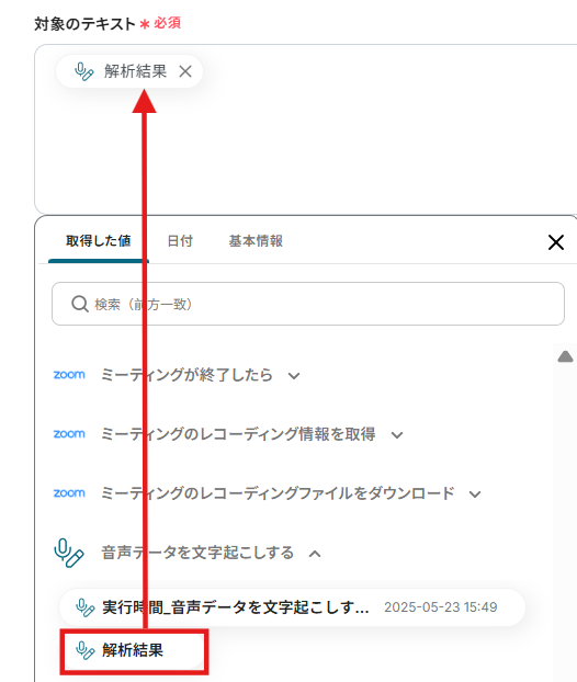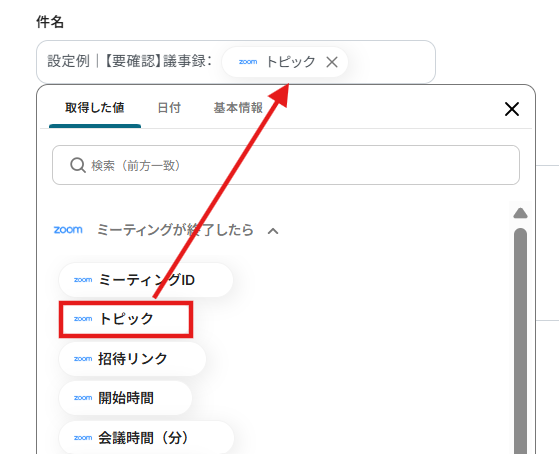 3.「ミーティングID」は先ほど取得したアウトプットから「ミーティングID」選択します。