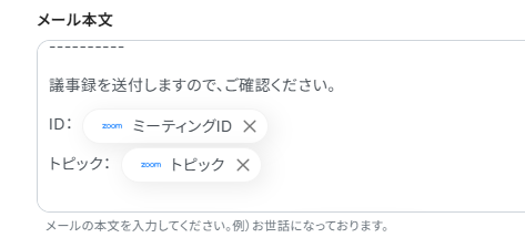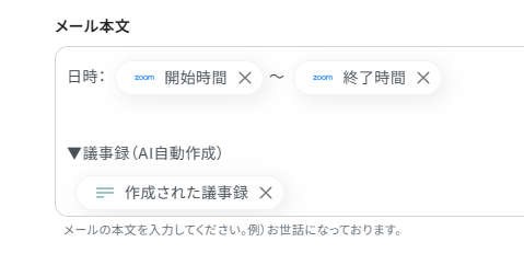 AI機能の「要約する」オペレーションでは、文字起こしされたテキスト全体から任意の指示による要約が可能です。 Zoho Mailの「メールを送信」オペレーションでは、送信先のメールアドレスを任意で設定できるのはもちろん、メールの件名や本文に、ミーティング名やAIが生成した要約といった前段階で取得した情報を変数として動的に挿入できます。また、固定の挨拶文や署名などを設定することも可能です。 ■注意事項