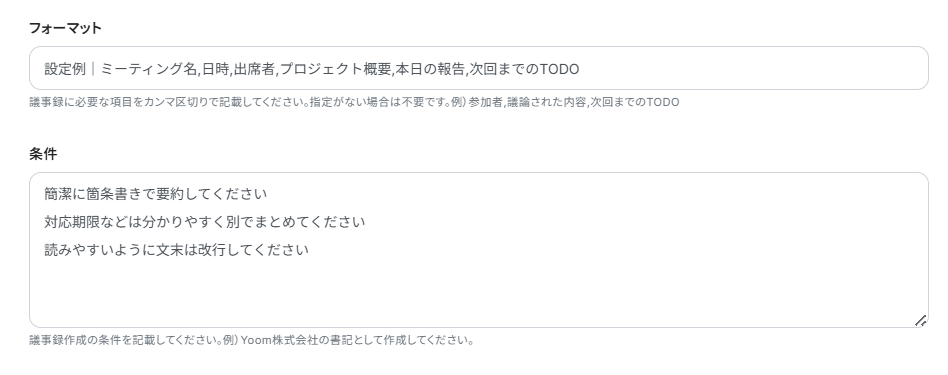 4.フォーマットと要約の条件には、要約の際にAIへ指示する内容を入力します。