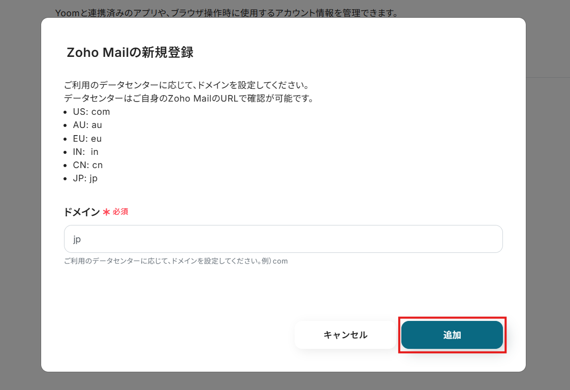 連携するアカウントのデータセンターに応じて「ドメイン」を設定し、「追加」をクリックしましょう。