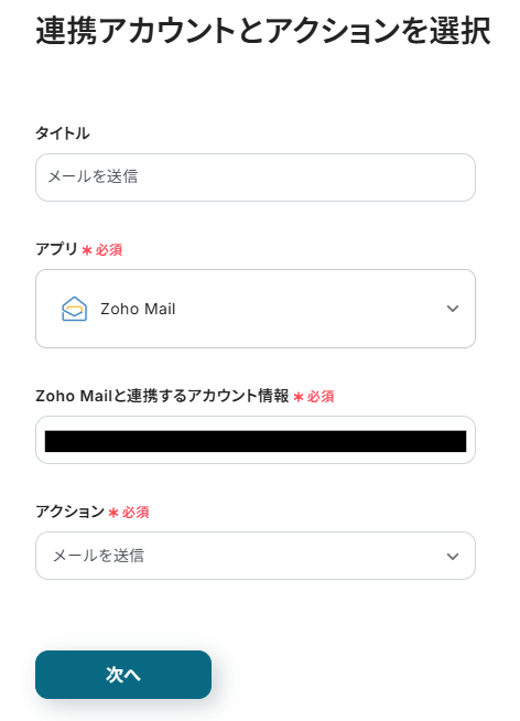 タイトルと連携するアカウント情報を任意で設定し、アクションはテンプレート通りに「メールを送信」のまま「次へ」をクリックして進んでください。