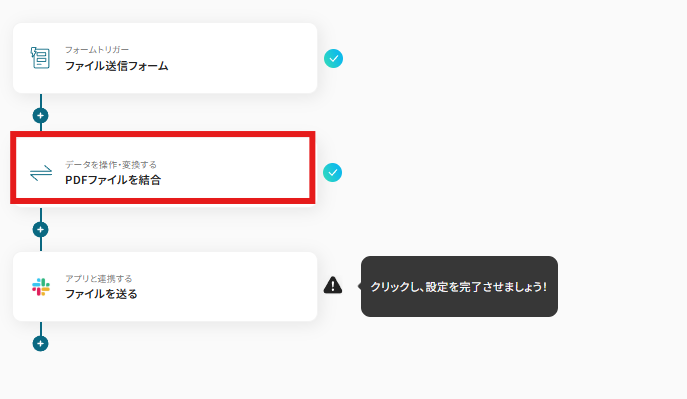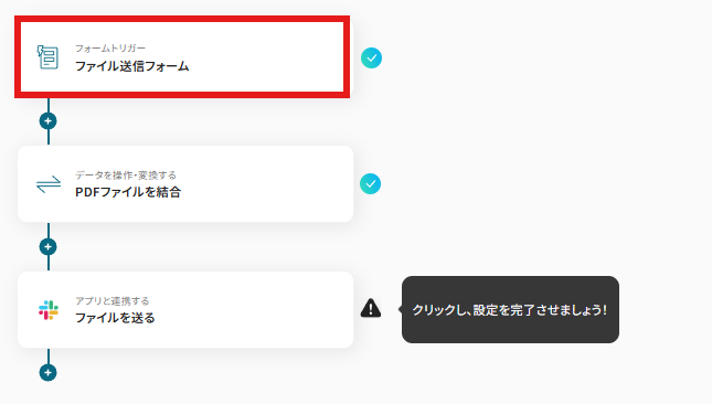 それではここから代表的な例として、入力フォームで送信された複数のPDFファイルを一つに結合し、その結合済みファイルをSlackに自動で通知するフローを解説していきます!