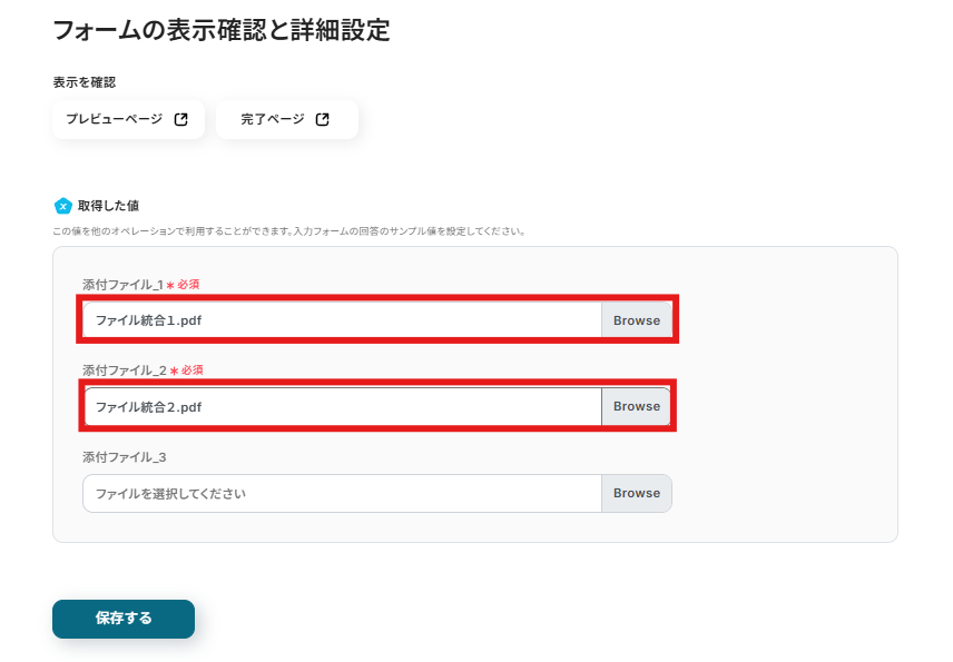 また、取得した値の箇所にPDFファイルを添付し、「保存する」をクリックしましょう。ここにアップロードしたファイルは、この後の設定で使用します。