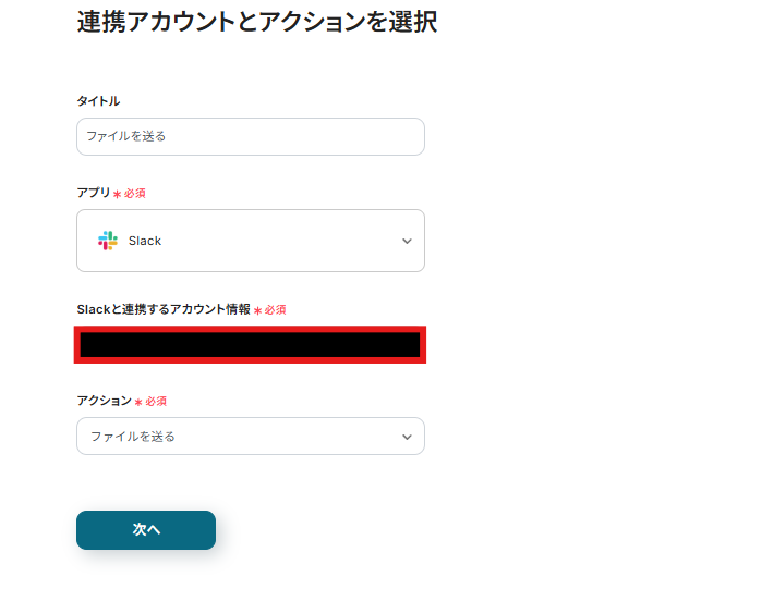 連携アカウントとアクションを選択する画面が表示されるので、今回連携するSlackのアカウントを確認し「次へ」をクリックします。