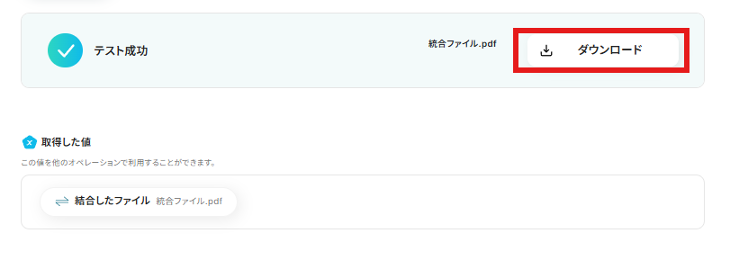 テスト成功後、実際に「ダウンロード」をクリックし、PDFファイルが統合されているか確認しましょう。