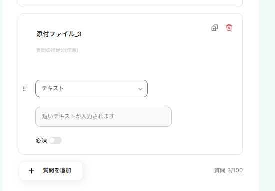 デフォルトでは2つの項目が設定されているので、追加したい場合は「質問を追加」をクリックして設定しましょう。