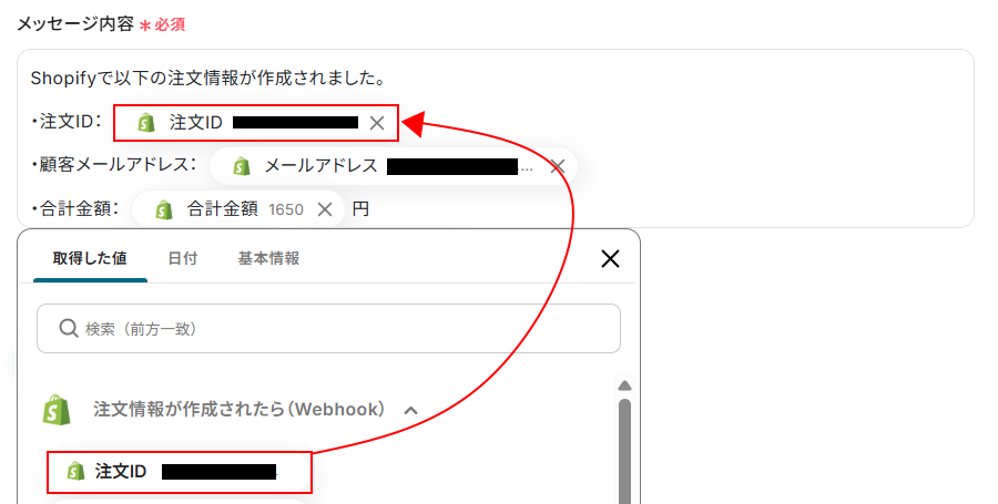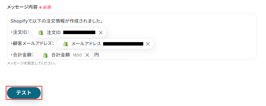 - 通知メッセージの本文も自由にカスタマイズが可能です。Shopifyの注文情報(顧客名、金額など)を本文に含めることで、通知を受け取った際に詳細な内容をすぐに把握できます。