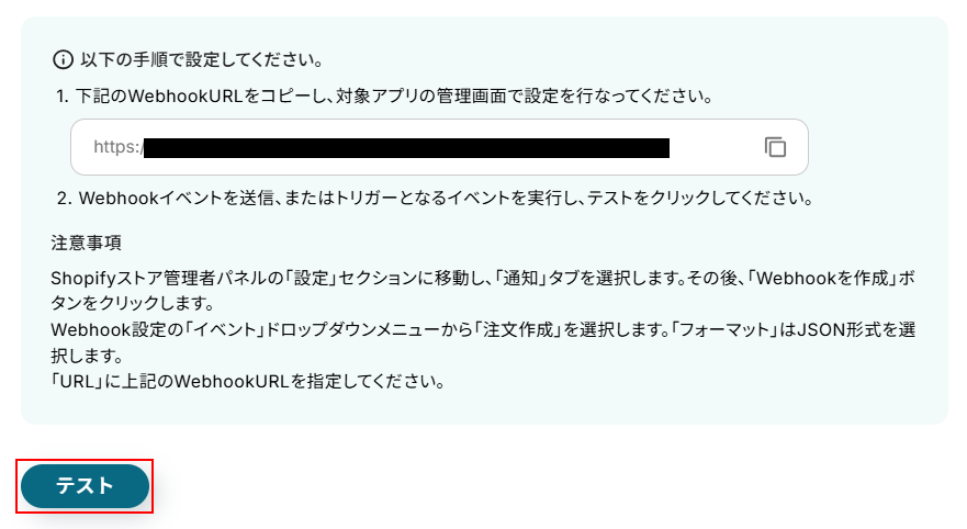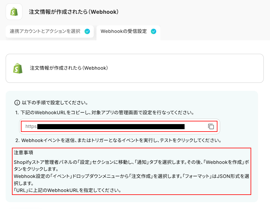 WebhookURLをコピーし、以下の注意事項を手順を確認しながら設定を行います。