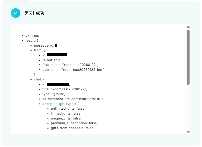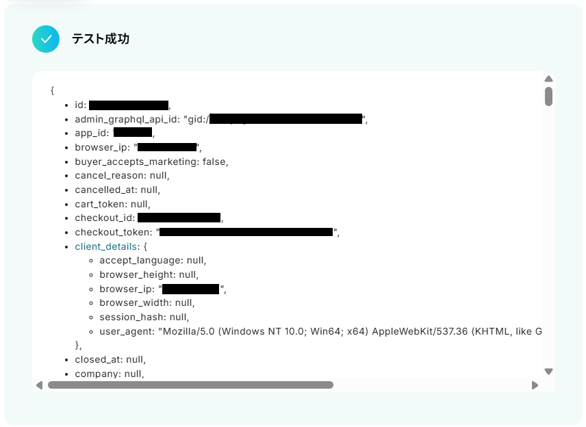 テストに成功するとテスト成功画面と取得した値が表示されますのでご確認ください。