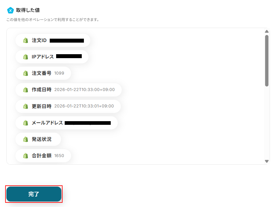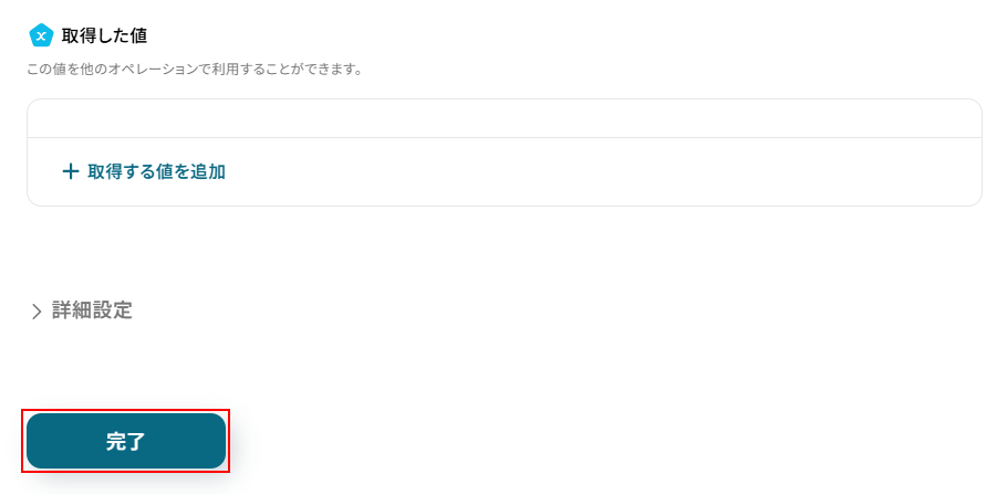 取得した値は実行した結果が設定される動的な値として利用できるため、このあとの設定でも使用します。