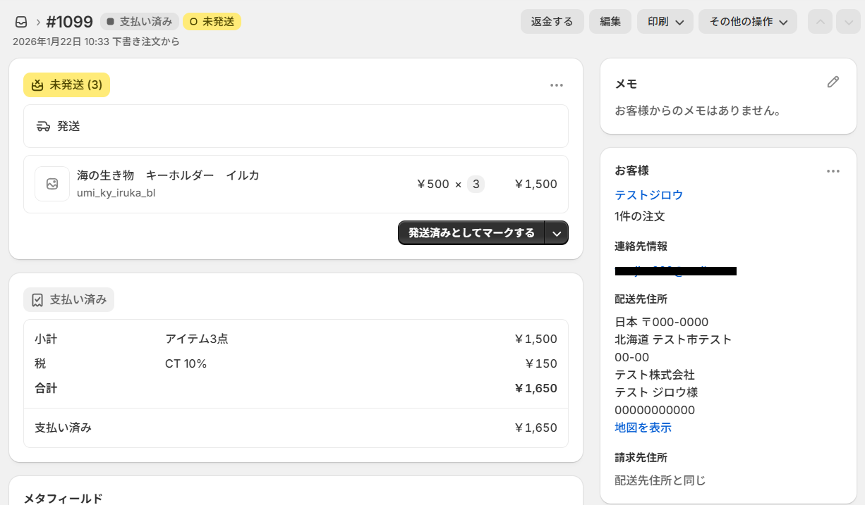 Webhookの設定ができたら、実際にテスト用の注文を作成しましょう。