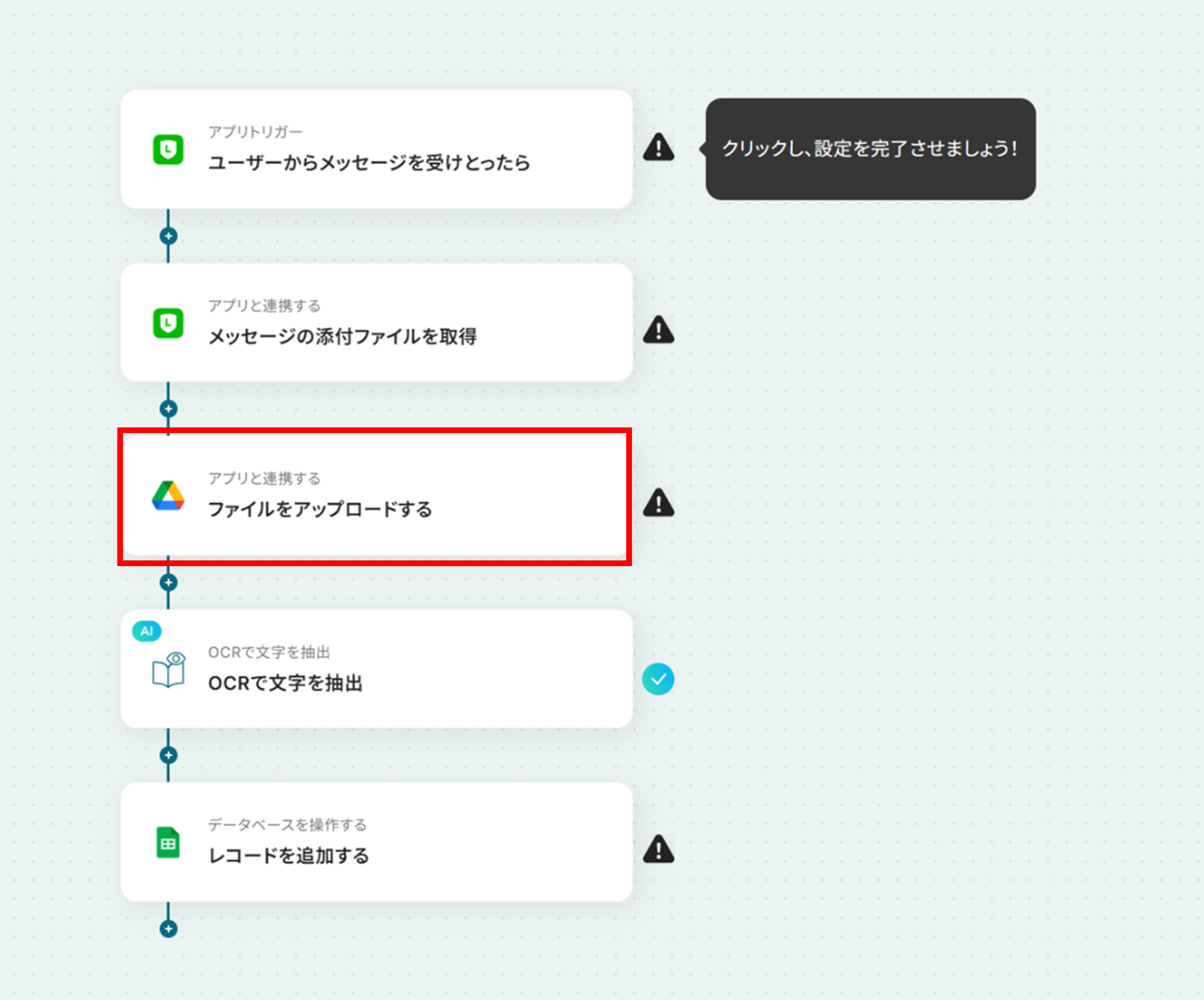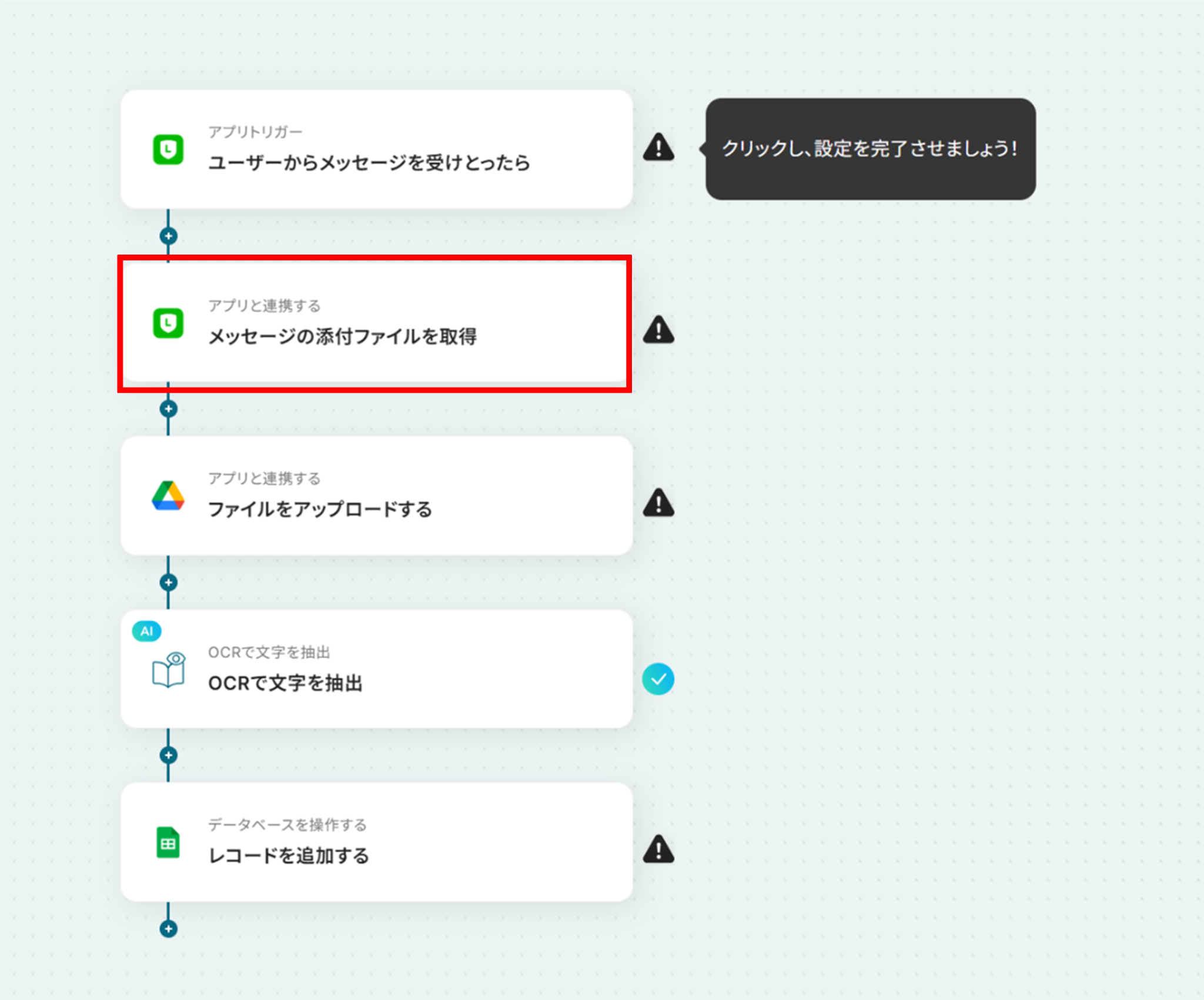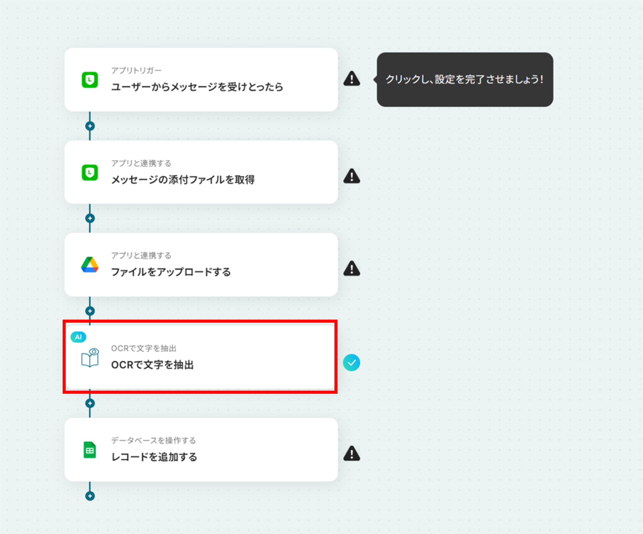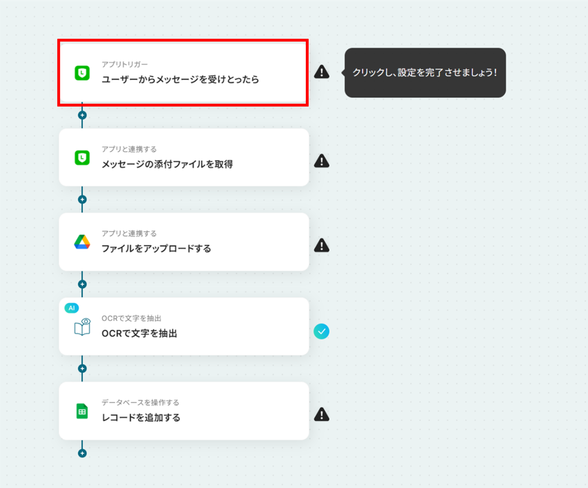 それではここから代表的な例として、LINE公式アカウントに投稿された銀行明細の画像をOCRで読み取り、Googleスプレッドシートに自動で記録するフローを解説していきます!