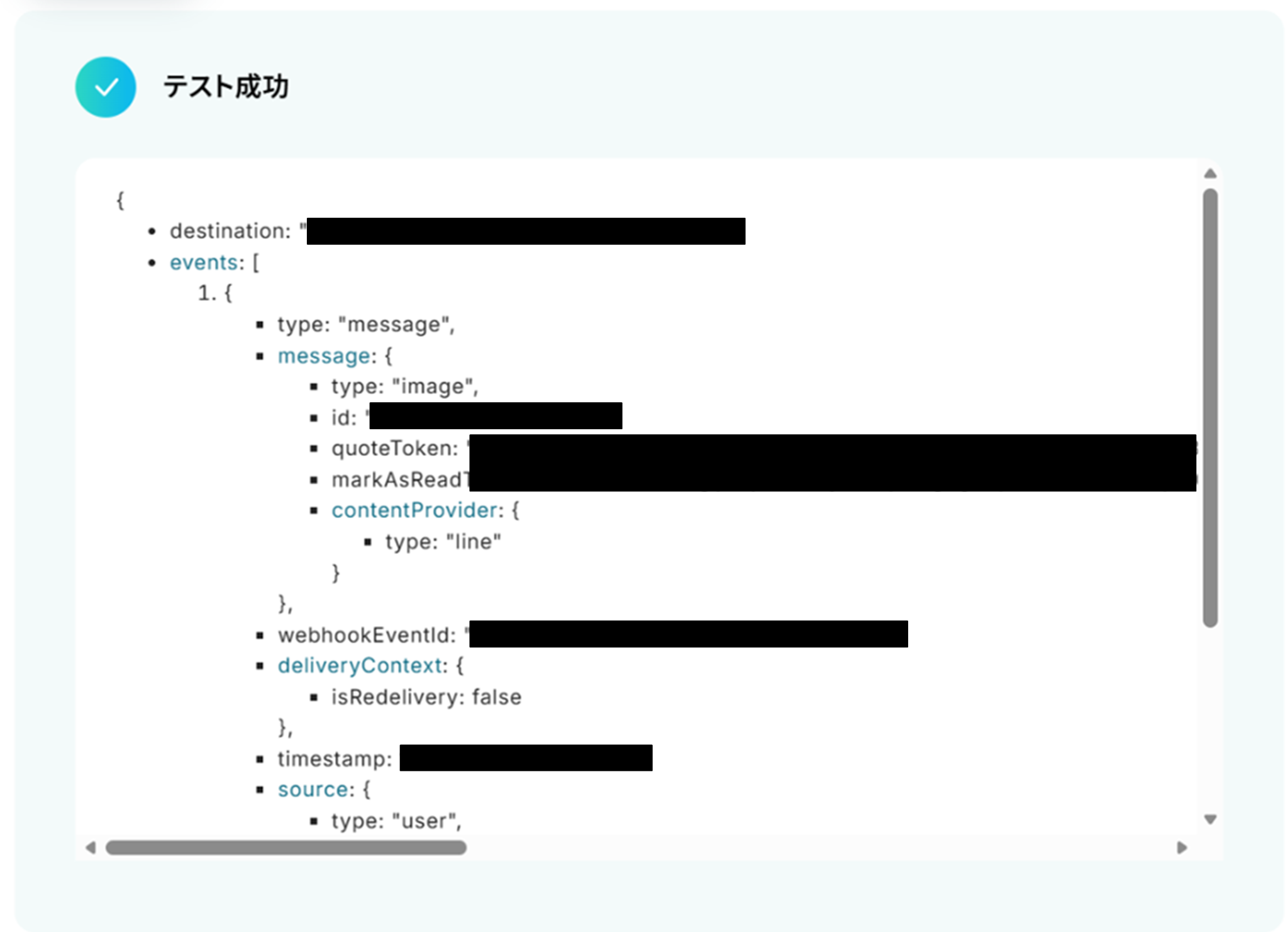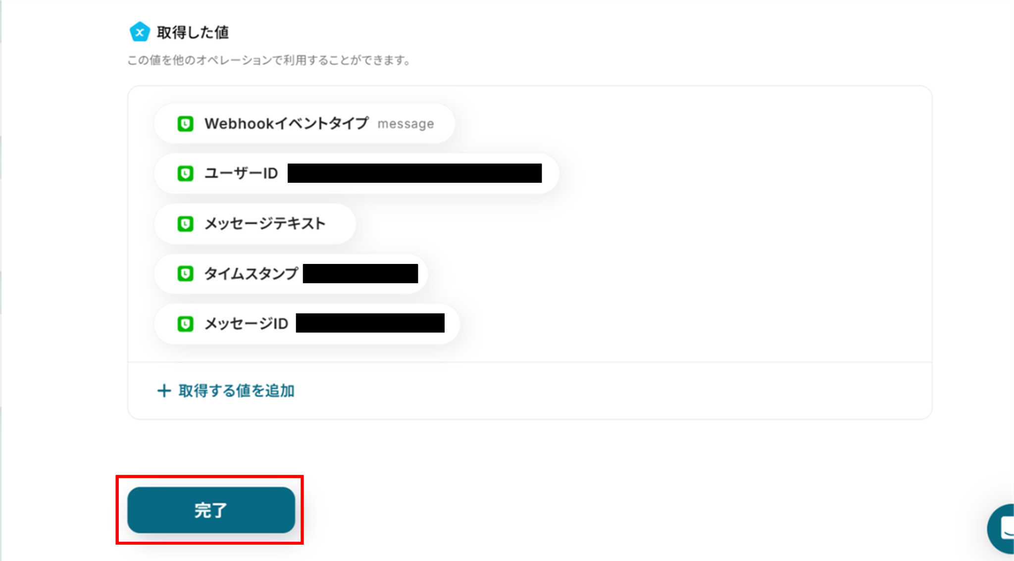 テストに成功すると「取得した値」にLINE公式アカウントの情報が反映されます。