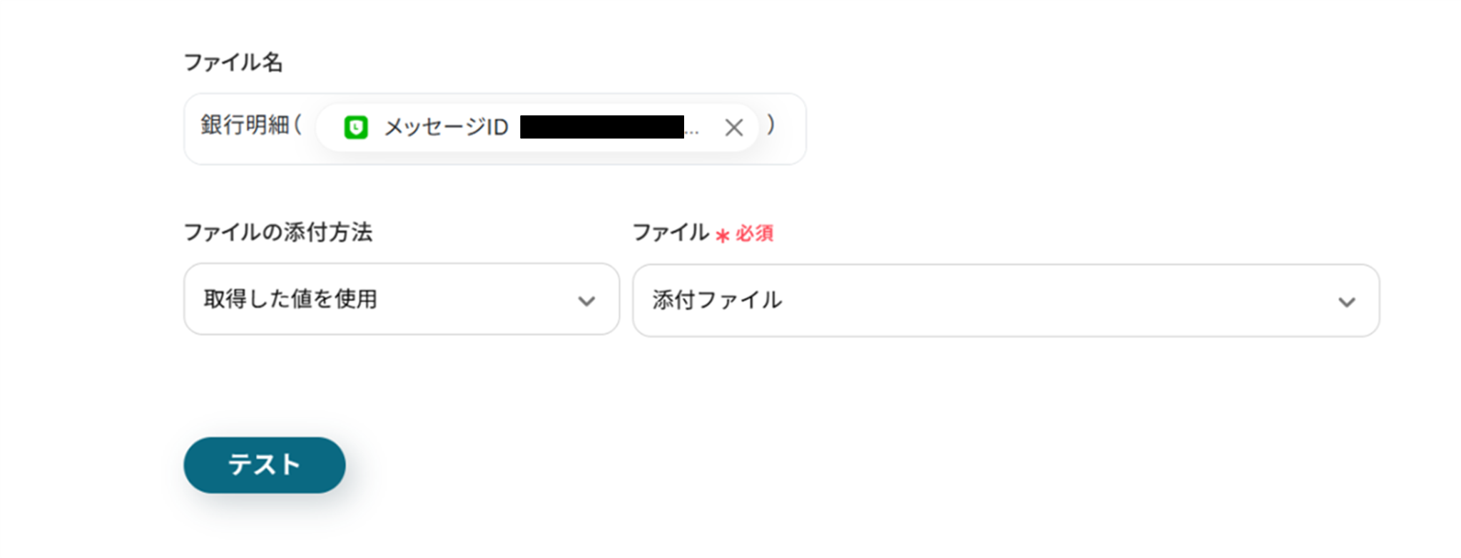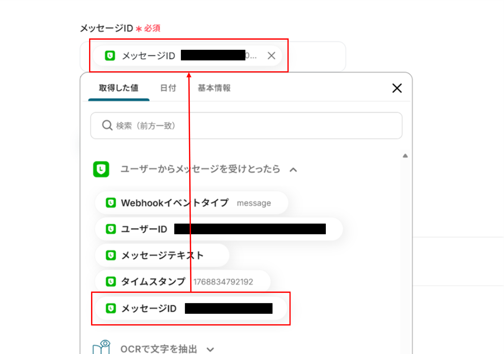 - OCR画像:プルダウンから「取得した値を使用」、「添付ファイル」を選択