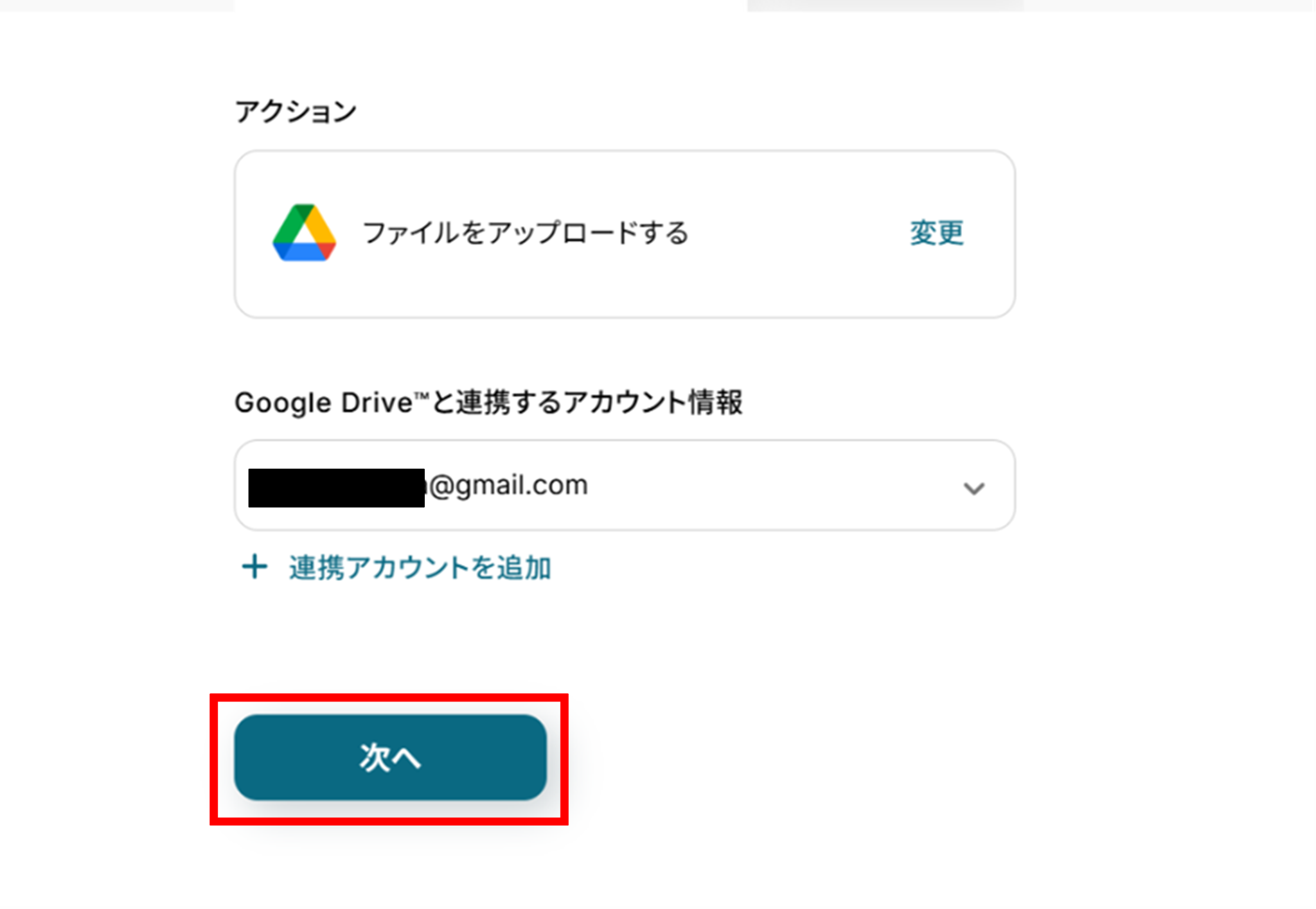 (2)「連携アカウントとアクションを選択」画面から、Google Driveと連携するアカウント情報に誤りがないかを確認し、アクションは「ファイルをアップロードする」のままで「次へ」をクリックします。
