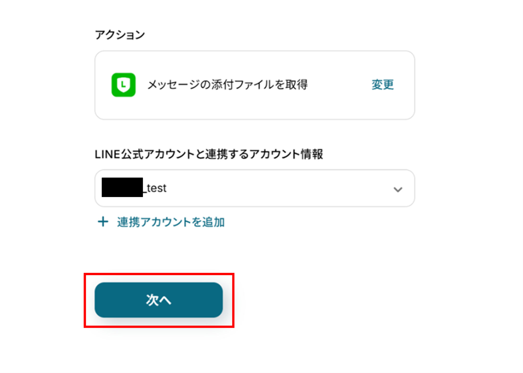 (2)「連携アカウントとアクションを選択」画面から、LINE公式アカウントと連携するアカウント情報に誤りがないかを確認し、アクションは「メッセージの添付ファイルを取得」のままで「次へ」をクリックします。