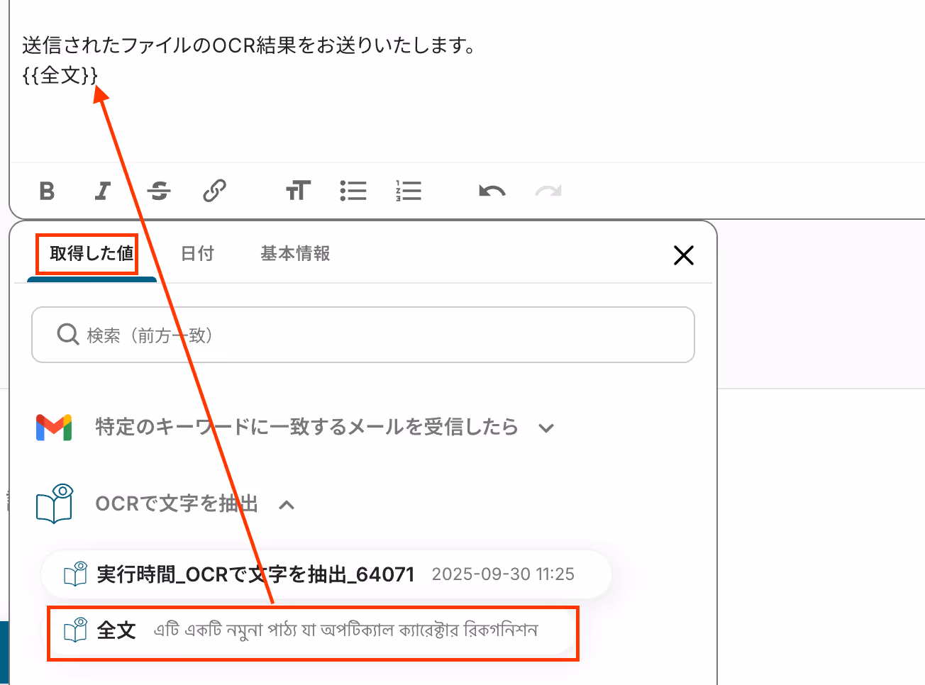 本文は添付画像のようにOCRで文字を抽出で取得した値を選択しましょう。
