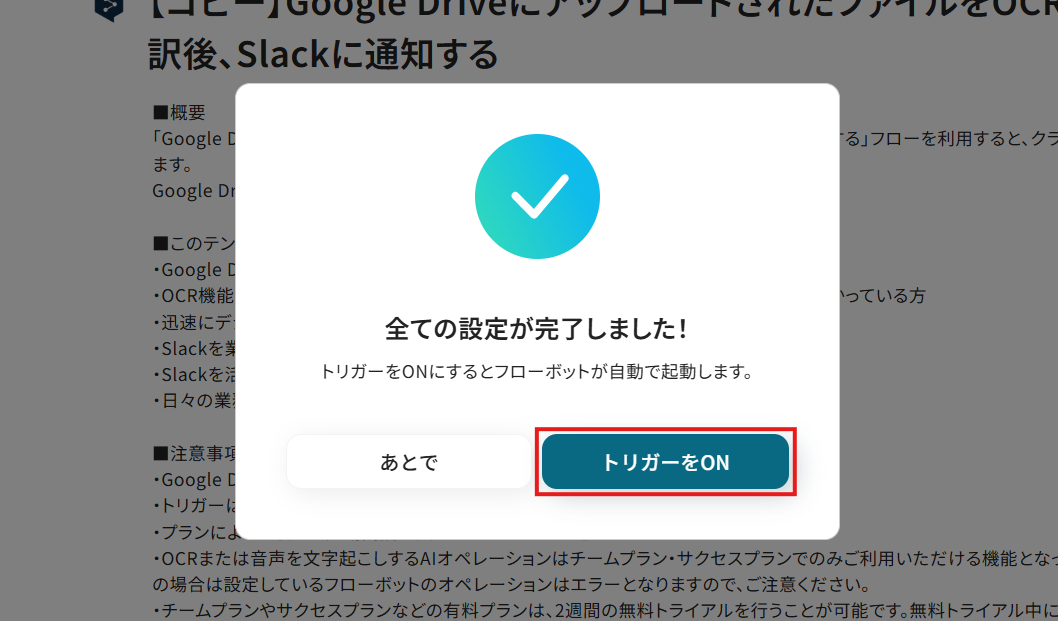 ここでは例として、「Google DriveにアップロードされたファイルをOCRで読み取り、DeepLで翻訳した結果をSlackに通知する」自動化フローの作成手順をご紹介します。