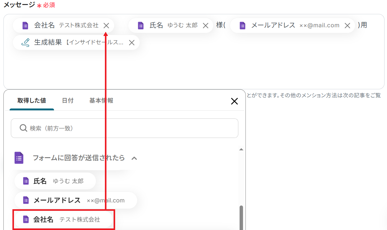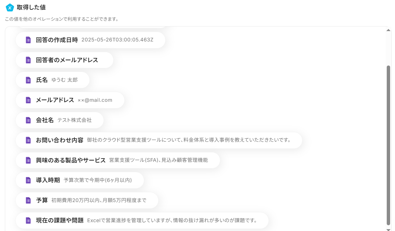 ステップ3で取得したアウトプットを利用すると、Googleフォームの内容を反映させることができます。