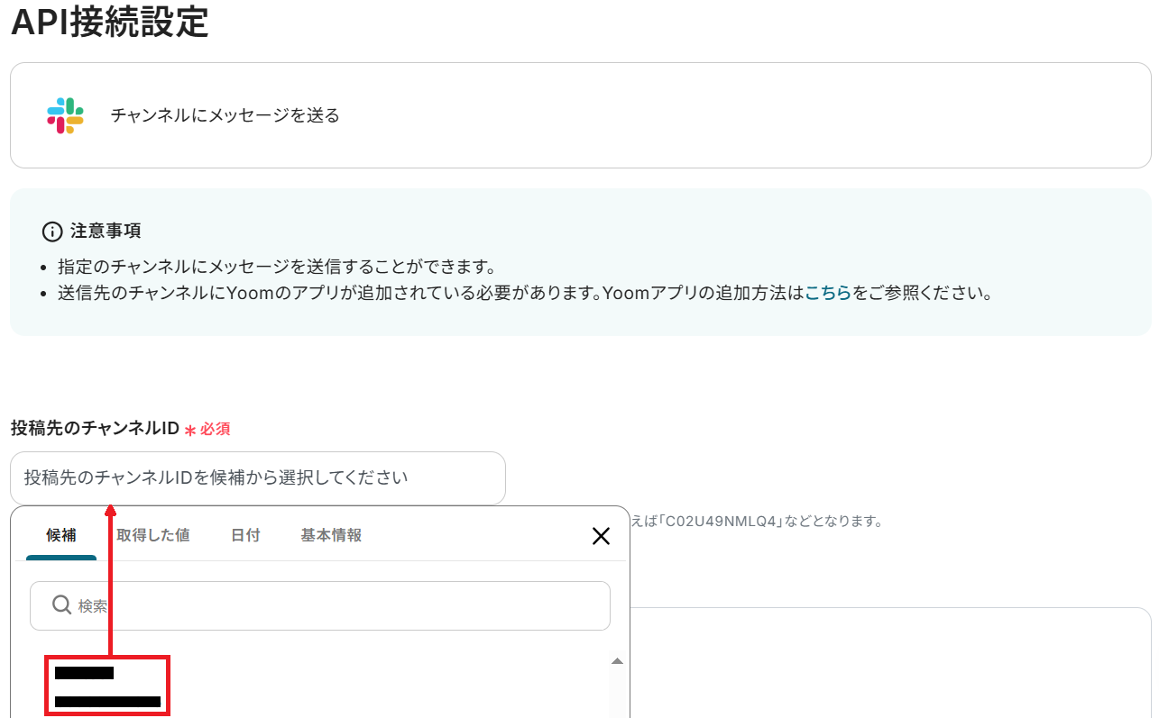 API接続設定に入ります。まず投稿先のチャンネルIDを選択してください。