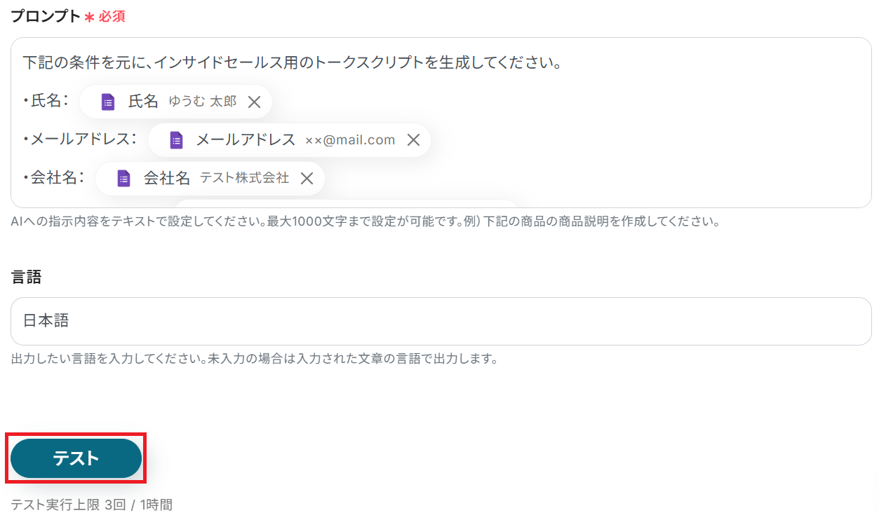 プロンプトは予め設定されている通りで大丈夫なので、任意で言語を入力してテストしましょう。