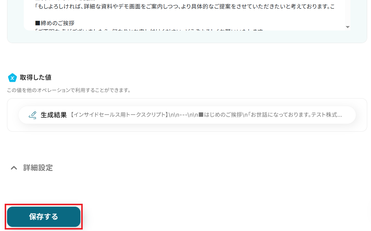 成功したら保存してください。AIがインサイドセールス用のトークスクリプトを出力してくれました!