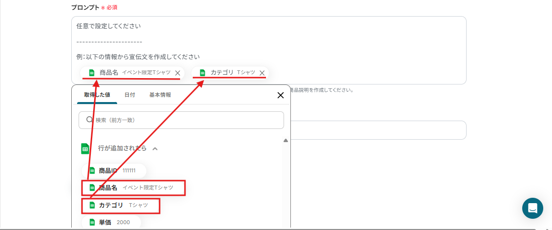 プロンプトは、下記画像のように初期設定されています。 この設定により、Google スプレッドシートに登録された「商品名」「カテゴリ」を取得し、自動でAIがX(Twitter)にポストするための文章を生成することができます! 生成する文章に条件を付けたい場合は、プロンプトを付け足してください。(「箇条書きで」や「ポップな感じで」等)