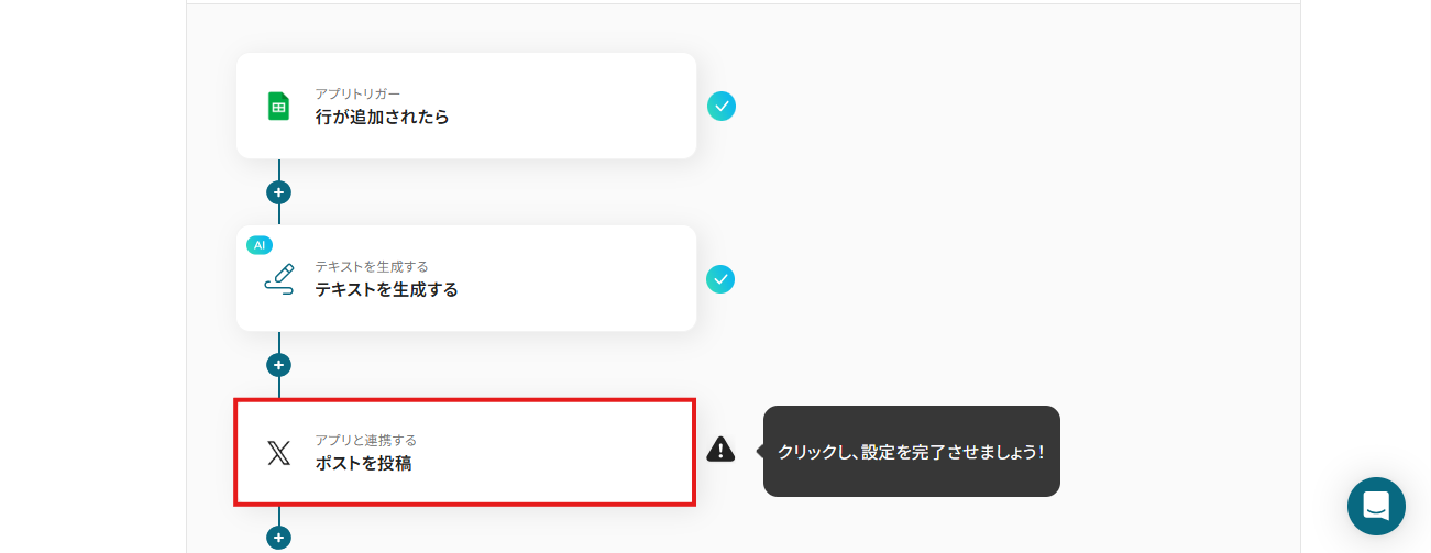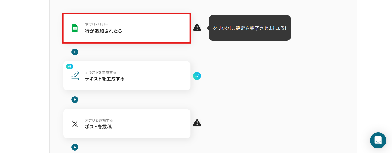 Google スプレッドシートのトリガー設定、AIおよびX(Twitter)のアクション設定