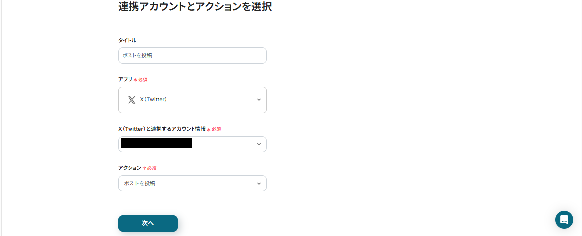 こちらのページも、初期設定済みのため、アクションが「ポストを投稿」になっていることを確認できたら、そのまま「次へ」をクリックしてください。