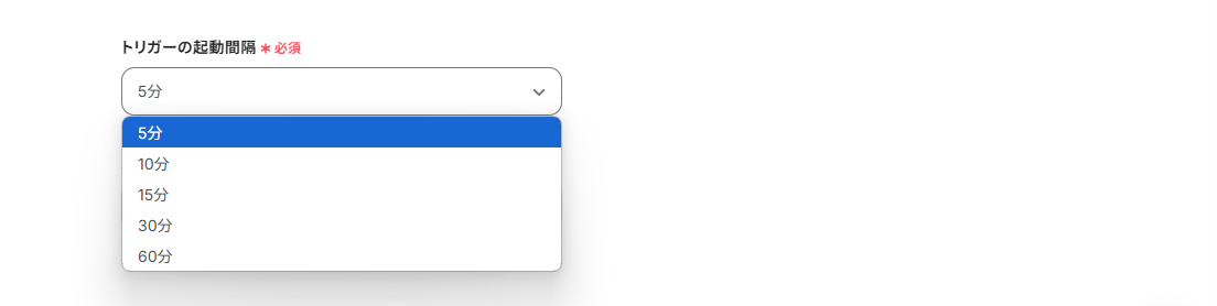 トリガーの起動タイミングは、5分、10分、15分、30分、60分から選択できます。 ご利用プラン によって、設定できるトリガーの最短間隔が違うので、ご注意ください。 基本的にはそのプランの最短の起動間隔にしてお使いいただくことをおすすめします。