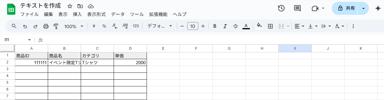 〈事前準備〉 X(Twitter)で自動的にポストするために使用する情報をまとめる、Google スプレッドシートを用意しましょう。 今回は、商品情報をまとめた下記のようなシートを用意してみました!