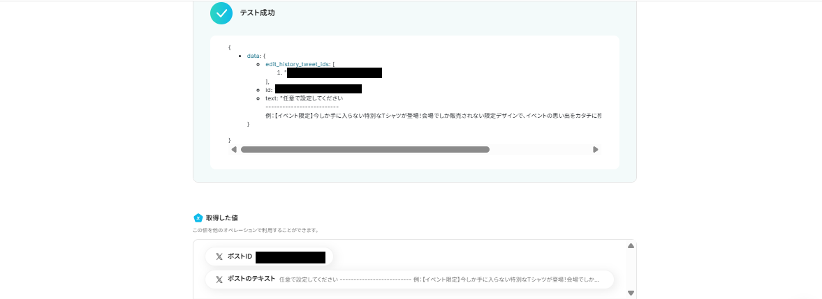 ポストのテキストは、デフォルトで設定されています。 この設定により、Google スプレッドシートに登録された情報から生成された文章を、自動でX(Twitter)のポストに設定し投稿することができますよ! 用途に合わせて、メッセージ内容を設定してみてくださいね。