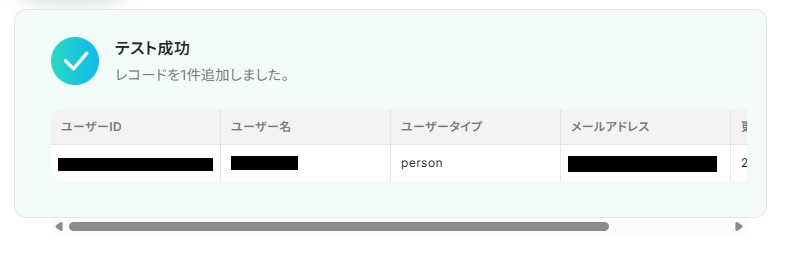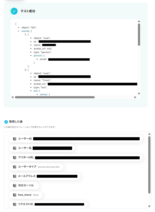 テストが成功すると、取得した値にユーザーリストが表示されます。 取得した値はこのあとの設定でも使用します。 ※取得した値 とは? トリガーやオペレーション設定時に、「テスト」を実行して取得した値のことを指します。 後続のオペレーション設定時の値として利用でき、フローボットを起動する度に変動した値となります。 「完了」を押して次に進みましょう!