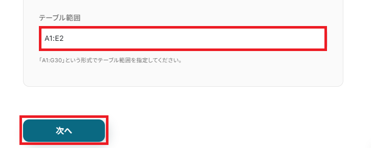 「スプレッドシートID」と「スプレッドシートのタブ名」は、ステップ4と同様のシートを設定しましょう。