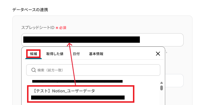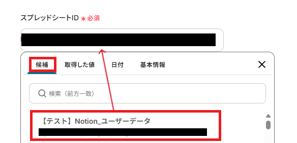 「スプレッドシートID」と「スプレッドシートのタブ名」は、入力欄をクリックして表示される候補から、ユーザーリストを選択してください。