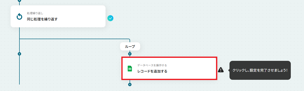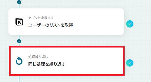 ステップ6:繰り返し対象の設定 取得したユーザーの数だけループ処理を行って、レコードに追加するよう設定していきます。 「同じ処理を繰り返す」をクリックしてください。