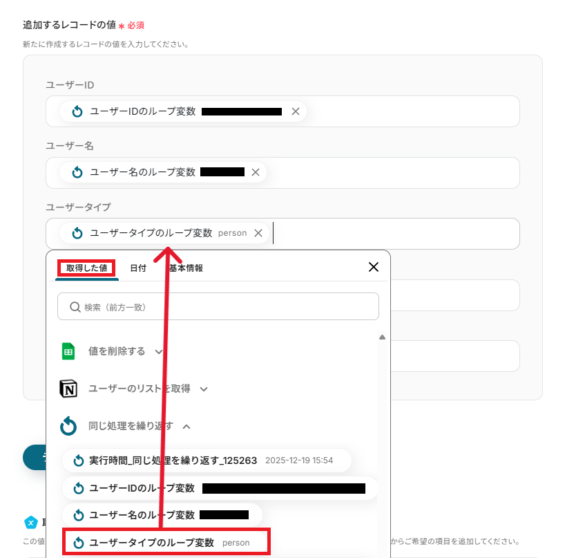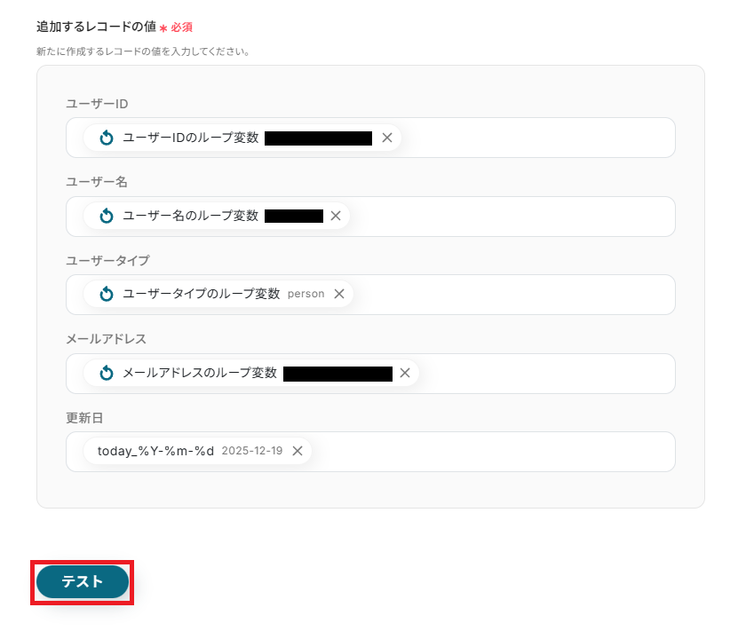 追加するレコードの値は、取得した値から【ループ変数】を引用しそれぞれ設定しましょう。