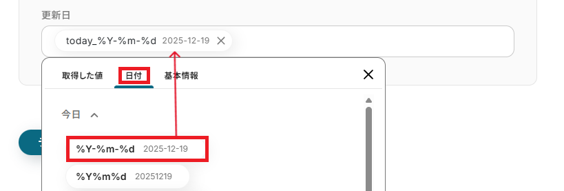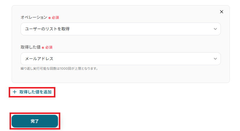 『+取得した値を追加』で項目を増やす事も可能です。 設定ができたら最後に「完了」をクリックしてください。