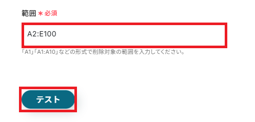 「テーブル範囲」は、シートに合わせ削除対象の範囲 を直接入力してください。 設定が完了したら「テスト」をクリックしましょう。