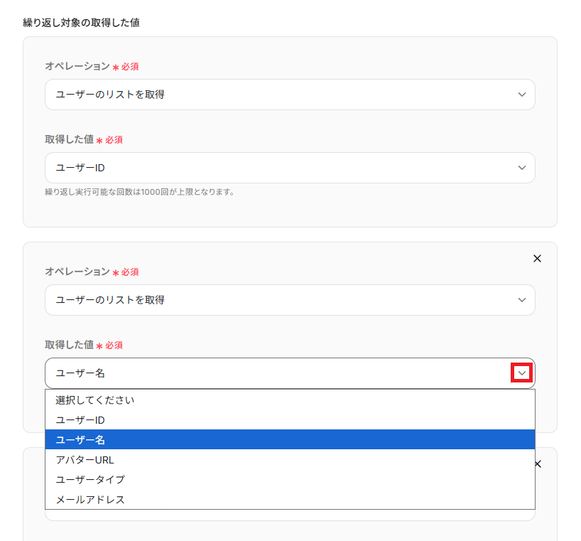 繰り返し対象の取得した値を設定します。 「オペレーション」はプルダウンから「ユーザーのリストを取得」を選択。 「取得した値」には、ループ処理で用いるレコードの項目(ユーザーIDやユーザー名など)を設定しましょう。