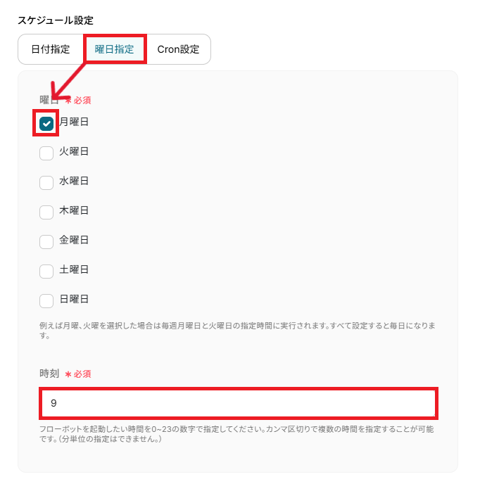 曜日指定以外にも、日付指定やCron設定を使用して自由に設定することができます。