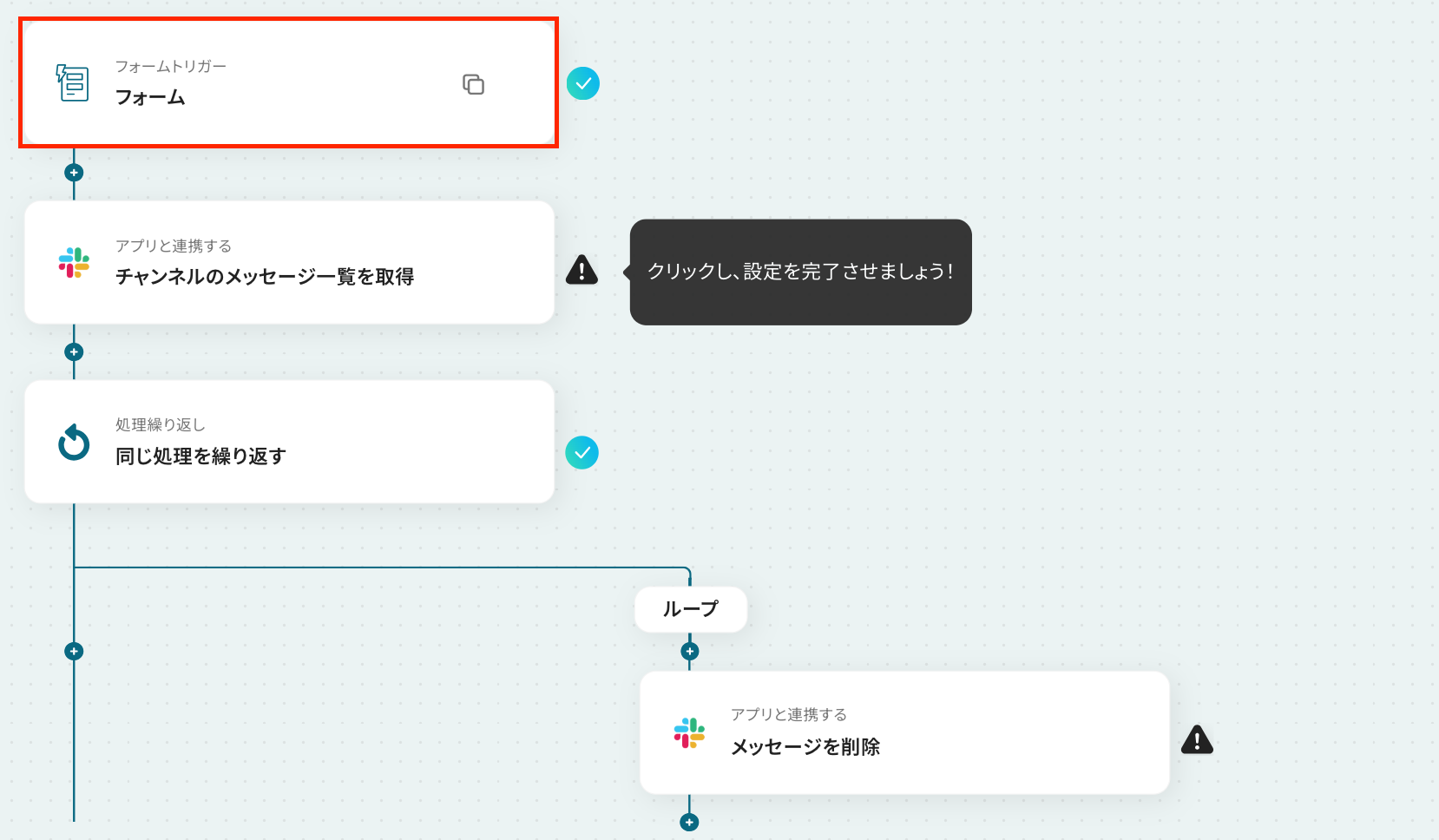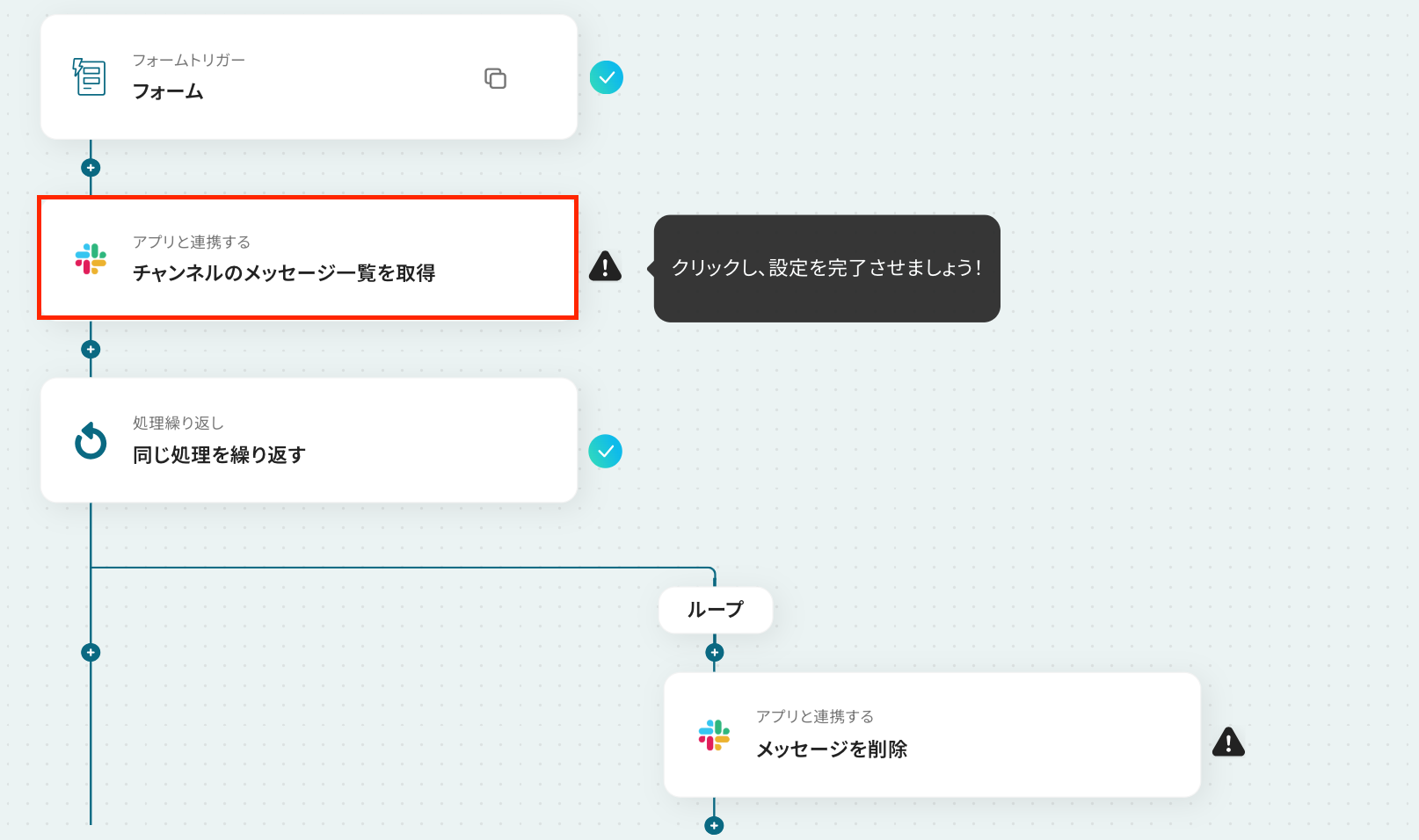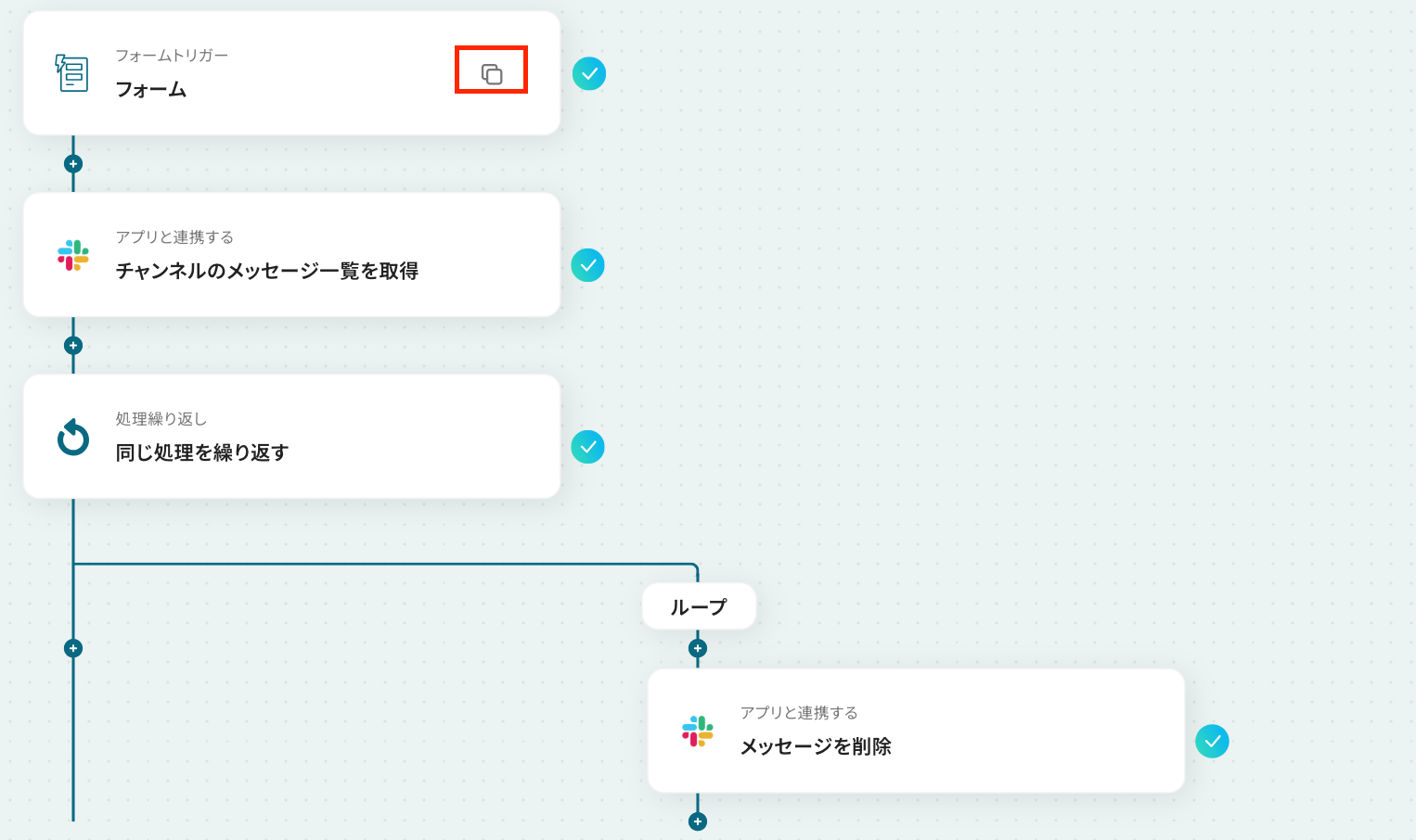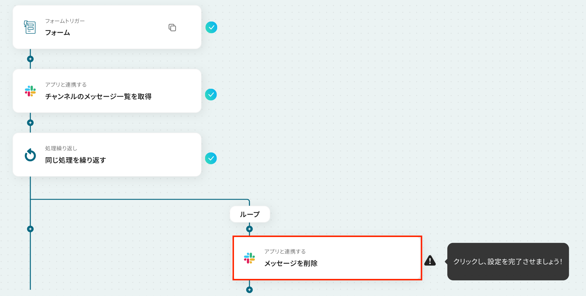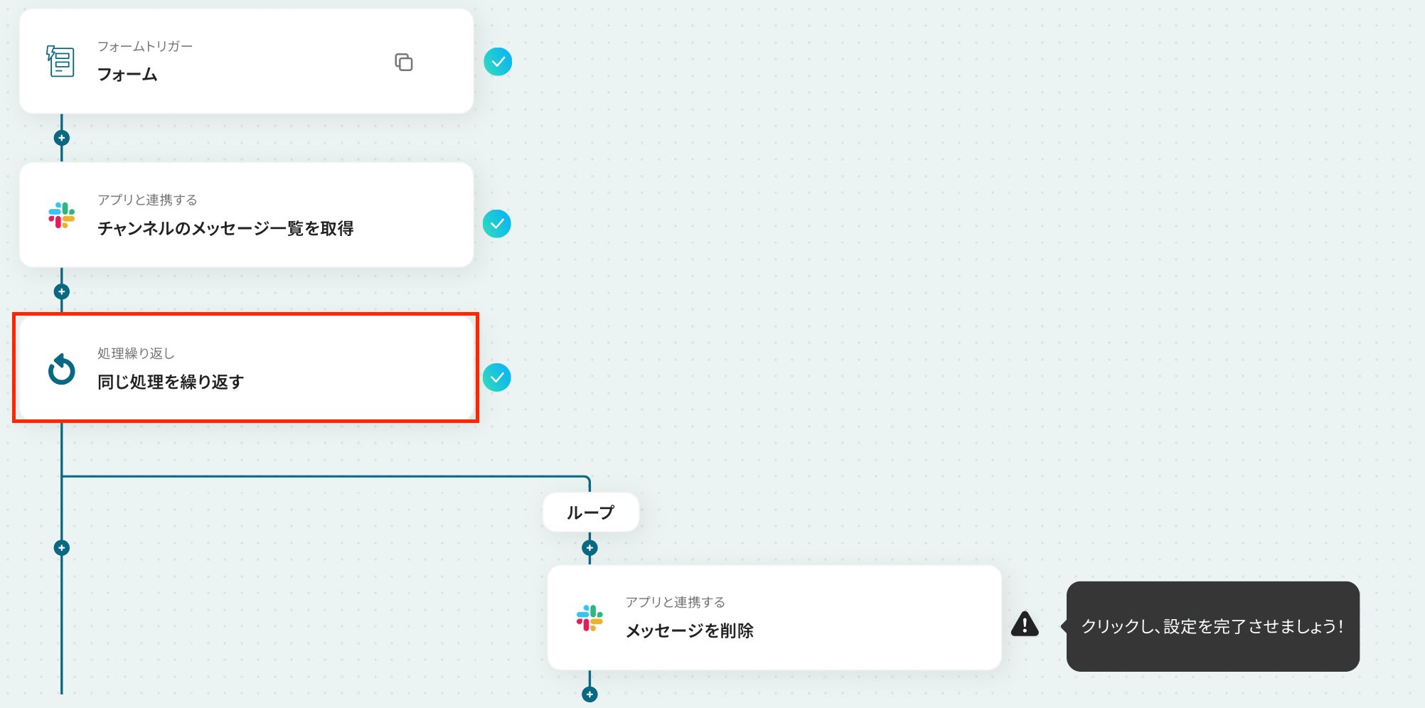- 最後に、繰り返し処理の中でSlackの「メッセージを削除」アクションを設定し、対象のメッセージを順番に削除します。