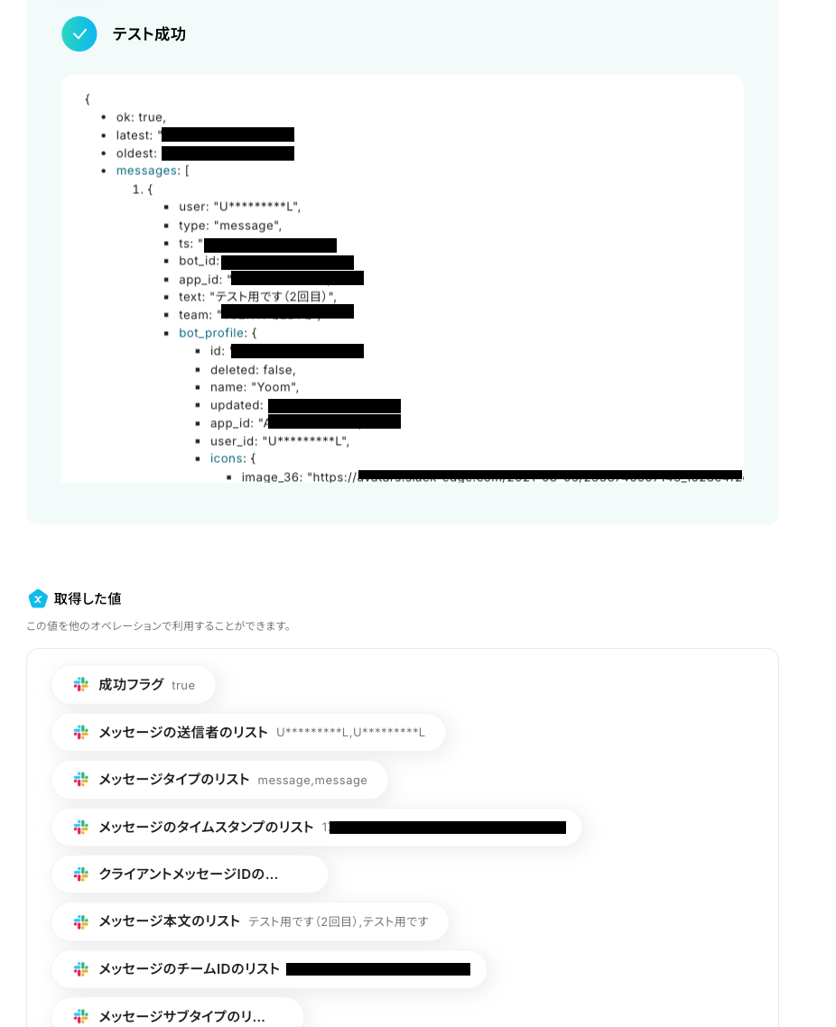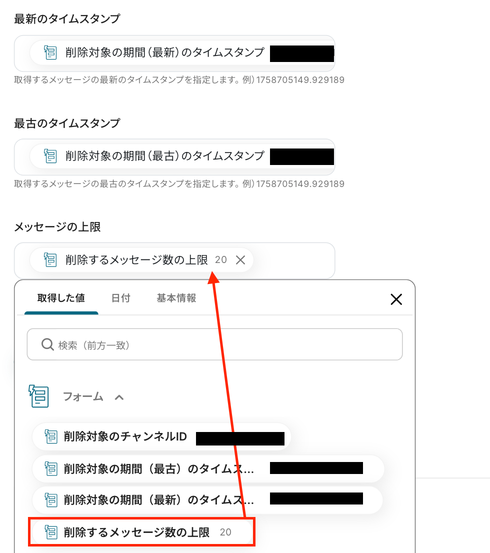 - Slackのメッセージを取得するオペレーションでは、削除対象とするメッセージの期間や一度に取得する件数などを、フォームから取得した値を使用して任意で設定できます。