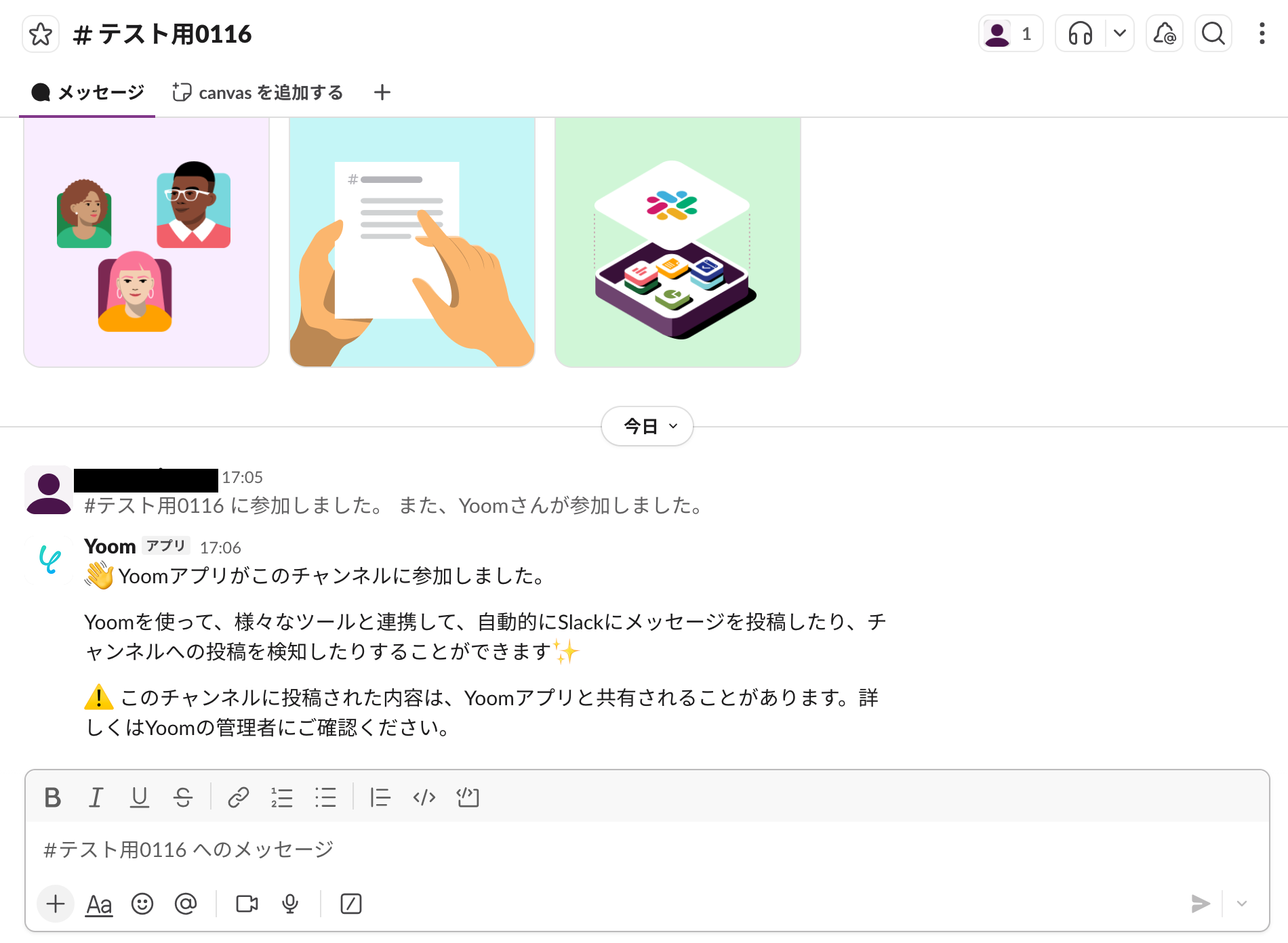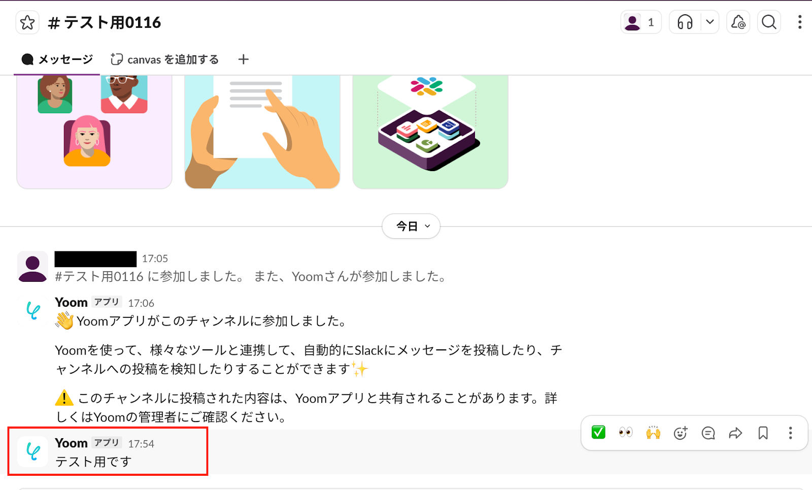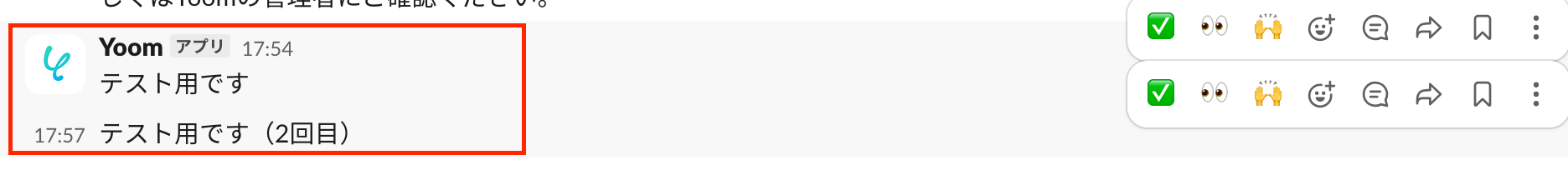 そのため、本フローを利用する場合はあらかじめ、Yoomのフローボットで「Slackにメッセージを送信」アクションを使って、Yoomアプリがメッセージを投稿していることが前提条件となります。下図が例です。