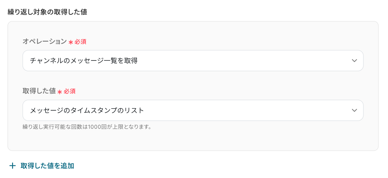 - 続いて、オペレーションで「繰り返し機能」を設定し、取得したメッセージ一つひとつに対して処理を行うようにします。