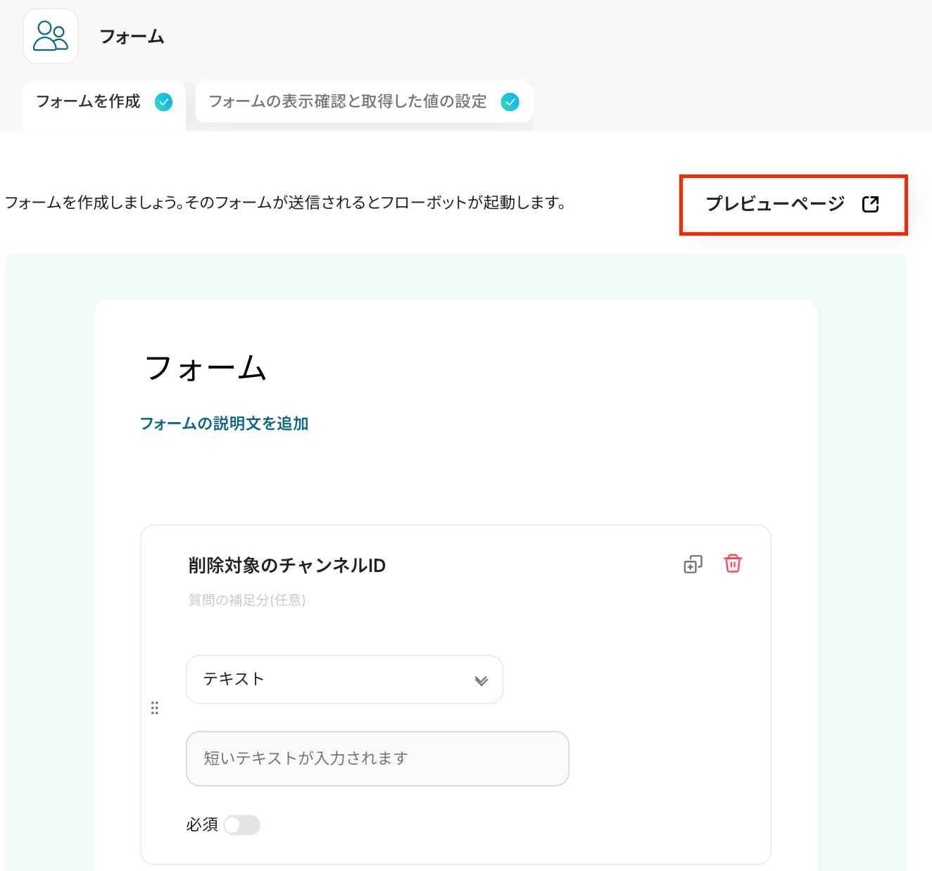 - トリガーとなるフォームには、削除対象のチャンネルを指定する項目や、削除を実行する前の確認項目など、任意の質問を追加、設定することが可能です。